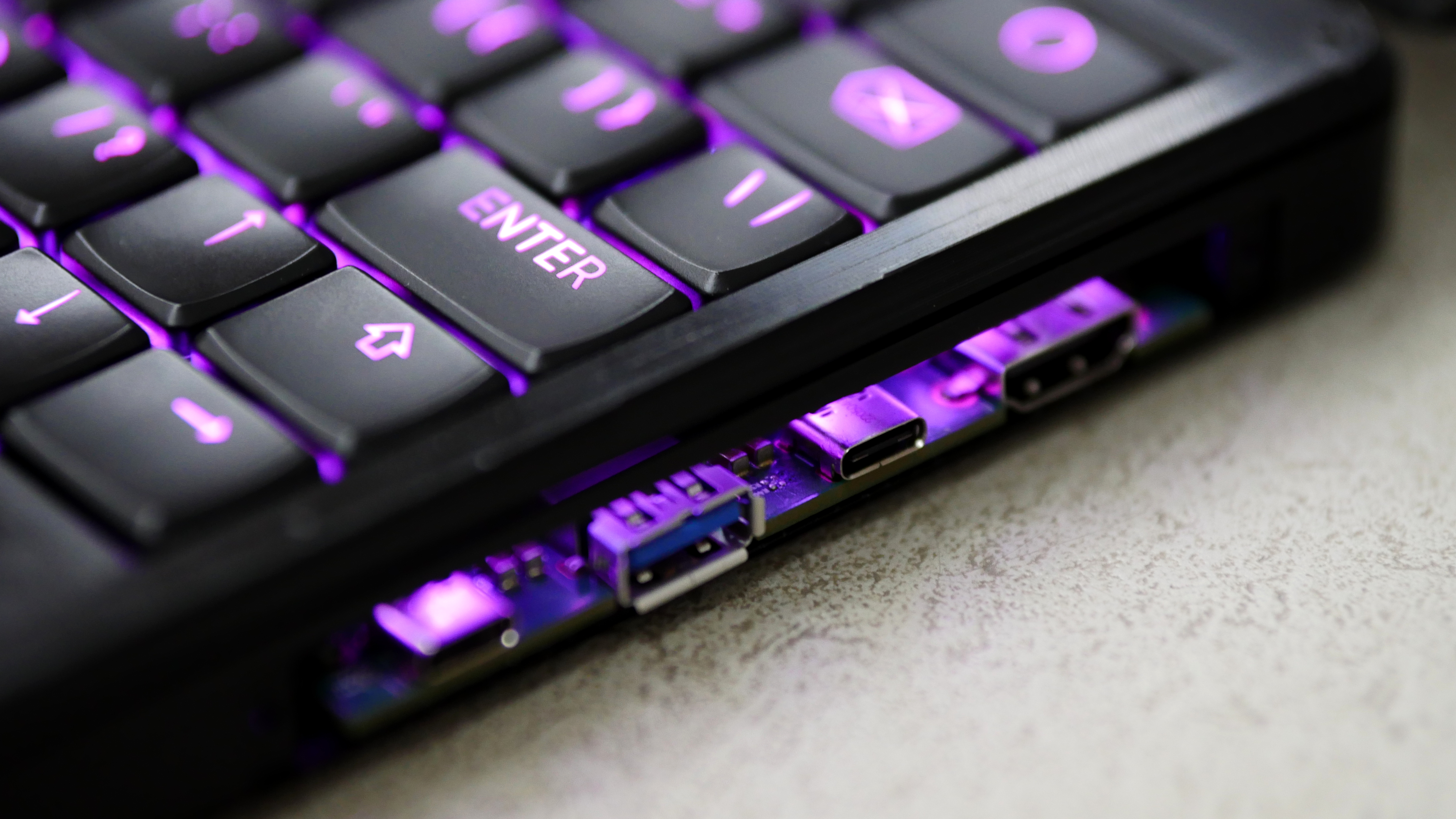 By default, this board doesn't expose any connectors to the outside. Instead, Wi-Fi/BT antennas are mounted on it, and the port cover is made from an RF transmissive material to allow for good reception. But you can customize this board while making use of the available space under/behind the keyboard to add external ports, like external antenna connectors, or back-facing USB.